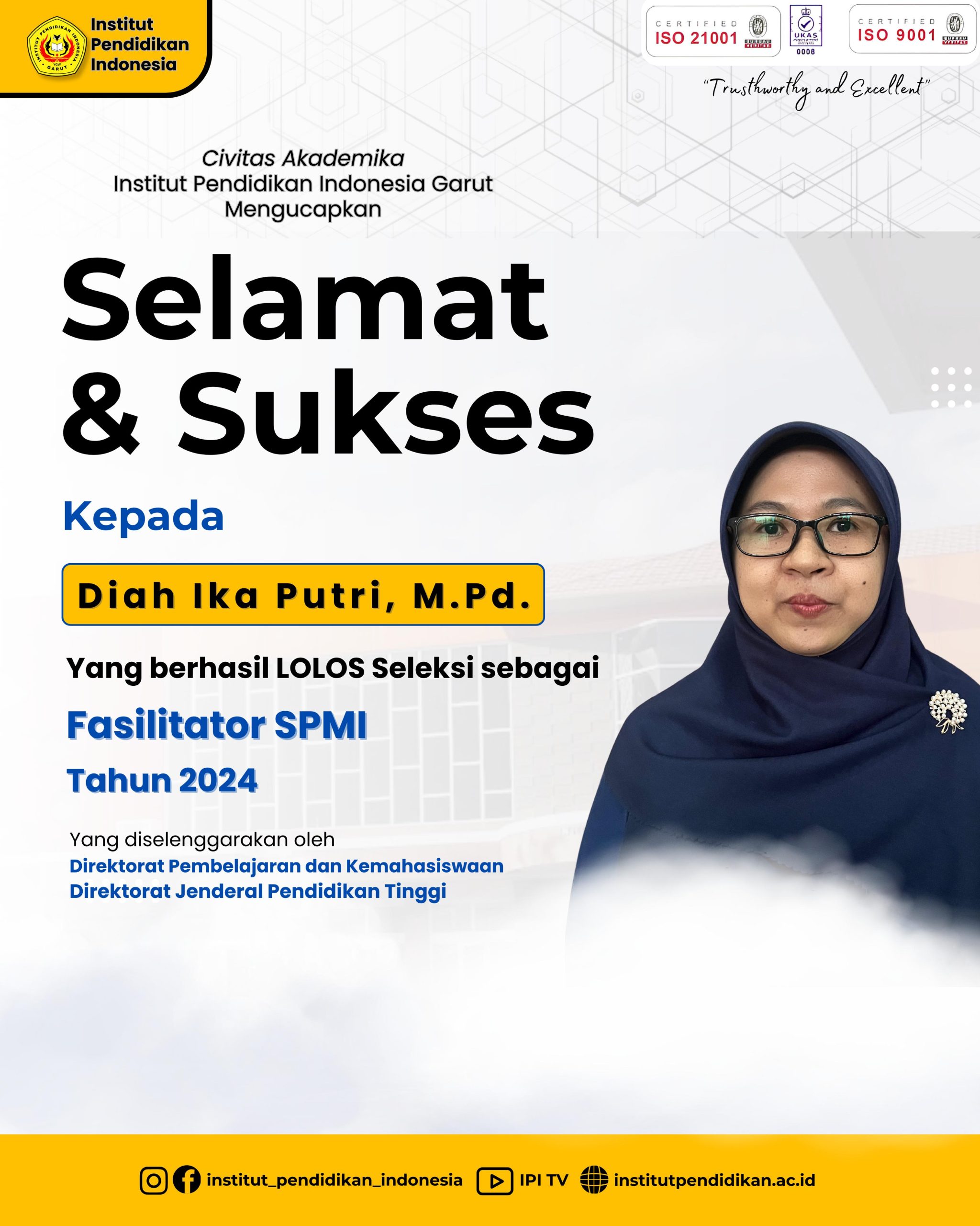 22 Apr, 2025 Dosen IPI Garut, Diah Ika Putri, M.Pd. Berhasil Lolos Seleksi sebagai Fasilitator SPMI Tahun 2024 yang Diselenggarakan oleh Direktorat Pembelajaran dan Kemahasiswaan Direktorat Jenderal Pendidikan Tinggi